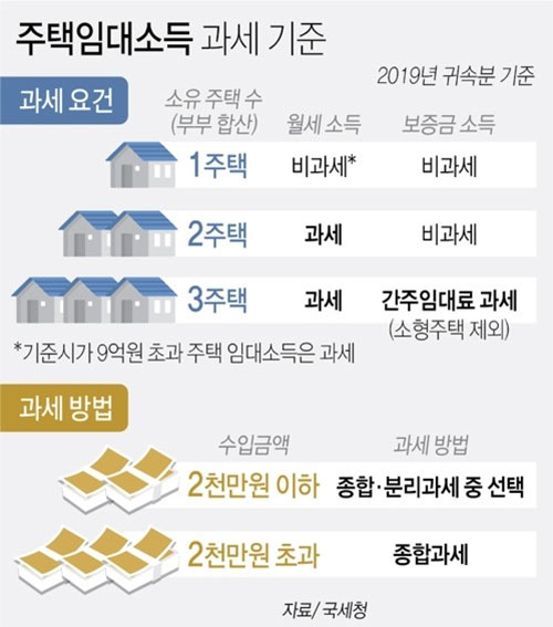 국세청은 지난 7일 기준시가 9억원을 넘는 주택을 월세로 준 1주택자, 월세 수입이 있는 2주택 이상 소유자, 보증금 합계가 3억원을 넘는(초과) 3주택 이상 소유자를 대상으로 지난해 주택임대소득이 연 2천만원을 넘지 않더라도 5월 1일부터 6월 1일까지는 '2019년도 주택임대 소득세를 주소지 관할 세무서에 신고·납부해야 한다고 통보했습니다.