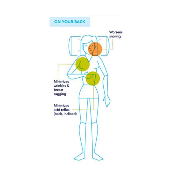 등을 대고 자는 자세가 가장 좋습니다. 등을 대고 자면 척추에 좋고 척추를 바르게 합니다. 이 자세는 등과 목 근육이 통증을 일으키지 않고 피부에도 좋은 자세입니다. 하늘을 보고 자는 자세는 옆으로 자거나 엎드려 자는 자세보다 얼굴에 주름이나 점이 빠르게 생기지 않아 여성에게 가장 좋은 자세입니다. 또한 등을 대고 자는 자세는 가슴이 늘어지거나 주름이 생기는 것을 방지할 수 있습니다. 다만 한가지 유일한 단점은 코를 고는 사람은 더 심해질 수 있다는 점입니다.