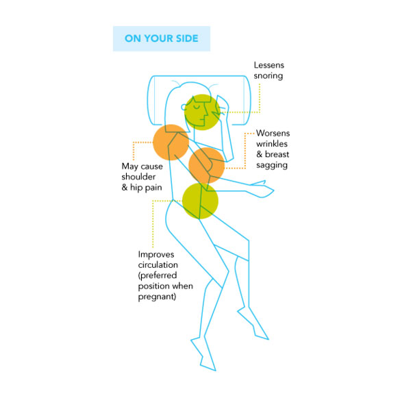 옆으로 잠을 자는 사람이 가장 많은 것으로 조사되었습니다. 옆으로 자게 되면 팔과 다리에 통증이 커질 수 있습니다. 한 방향으로만 계속 자게 되기 때문인데요. 오른쪽으로 잘 경우에는 소화 장애나 속 쓰림이 생길 수 있다고 합니다. 옆으로 잠을 자게 되면 혈액 순환이 좋아지고 코를 더 적게 골게 된다는 정점은 있다고 하네요.