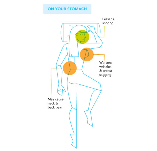 배를 대고 엎드려 자는 자세는 가장 건강에 좋지 않다고 합니다. 머리가 완전히 옆으로 돌아가 있기 때문에 몸에 불편함을 줘 등에도 문제가 생길 수 있습니다. 척추는 이상한 자세를 취해야 하기 때문에 자면서 몸을 자꾸 움직이게 됩니다. 이로 인해 수면에 방해가 될 수 있고 자고 일어나면 기분도 좋지 않을 것입니다. 단 한가지 장점이라고 한다면 코 고는 것을 줄여준다는 것 뿐입니다.