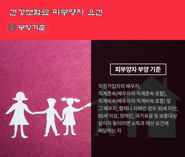 피부양자 자격 인정을 위한 부양 기준을 살펴보면 형제, 자매, 며느리, 사위는 제외됩니다, 즉, 경제적으로 자립했다고 보기 어려운 30세 미만, 65세 이상, 장애인, 국가유공 및 보훈대상 상이자 등은 소득과 재산 기준을 충족하는 경우 피부양자 자격을 인정해 줍니다.