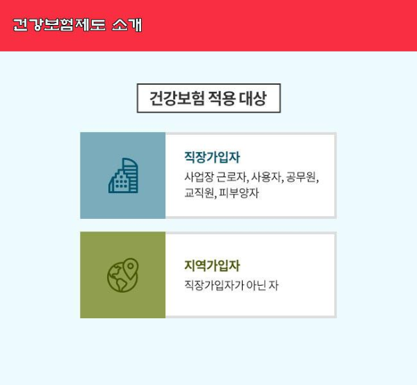 건강보험 적용 대상은 직장가입자와 지역가입자로 구분됩니다. 건강보험료 지역가입자는 직장가입자를 제외한 자가 대상이 되며 직장가입자는 사업장 근로자와 사용자, 공무원, 교직원, 그리고 그 피부양자가 대상입니다. 참고로 건강보험료 조정은 상황에 따라 매년 이루어지고 있는데 만약 본인의 건강보험료 계산을 미리 해보고 싶다면 국민건강보험공단 홈페이지에서 모의계산이 가능하니 참고하시기 바랍니다.