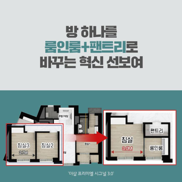 최근 대구에 공급 소식을 알린 더샵 프리미엘의 시그널 3.0은 활용도가 낮은 방 하나를 룸인룸과 팬트리로 나누는 혁신을 선보였습니다. 침실의 폭을 2.7m에서 3m까지 넓히고 남은 공간을 별실로 활용하는 룸인룸과 팬트리로 바꿔 수납공간을 강화하고 공간 활용도를 높인 설계가 돋보입니다.