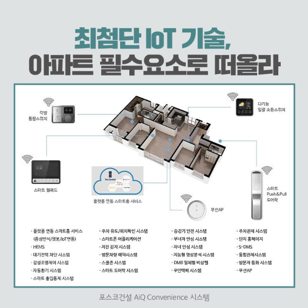 생활편의성을 높이는 최첨단 loT 기술도 경쟁적으로 도입되고 있습니다. 주택에 적용되는 첨단 IoT시스템이 과거에는 있으면 좋고 없으면 아쉬운 정도였다면 현재의 소비자에게는 세대 내 가전 설비를 통합해서 제어하는 월패드, 일괄 소등 스위치, 주차관제 시스템 등의 기술이 필수요소로 인식되고 있습니다. 더샵 프리미엘의 시그널 3.0은 현재 주택시장의 IoT 기술트렌드를 한 눈에 보여줍니다. 포스코건설이 개발한 스마트기술 브랜드 아이큐텍(AiQ TECH)의 서비스를 총망라한 결정체입니다,