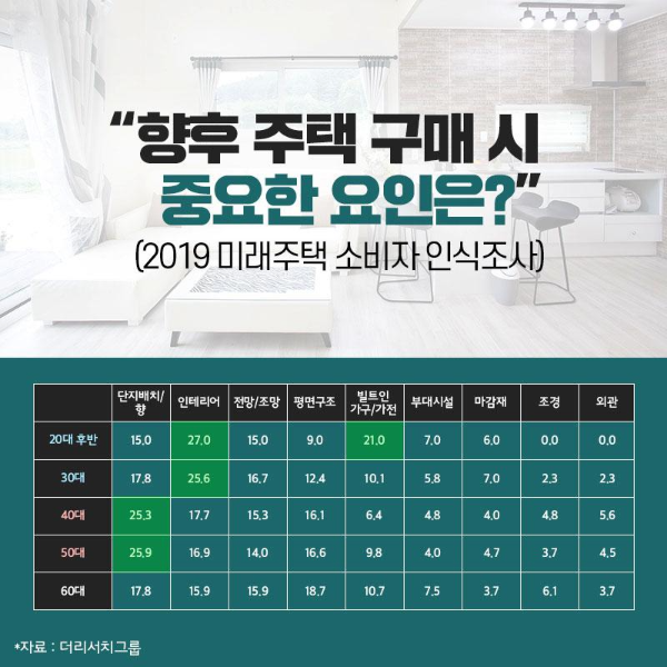 새로운 주거트렌드를 선도하는 에코세대는 과거 주택 상품성에서 가장 중요하게 여겼던 남향과 단지배치에 그다지 큰 비중을 두지 않습니다. 오히려 과거에는 부수적인 요소로 여겨졌던 인테리어와 스타일이 상품성을 평가하는 가장 중요한 요소로 여기고 있습니다. 지난해 11월 더리서치그룹이 수도권 주택 소유자 1,000명을 대상으로 조사한 '2019년 주거공간 소비자 인식조사' 에 따르면 20대 후반과 30대 응답자는 '향후 주택 구매 시 중요한 요인'의 첫번재로 인테리어·스타일(27.0%, 25.6%)을 꼽았습니다. 단지 배치·향은 응답률이 15.0%와 17.8%에 그쳐 여전히 단지배치·향(25.3%)을 인테리어·스타일(17.7%)보다 중요하게 생각하는 40대와는 확연한 차이를 보였습니다.