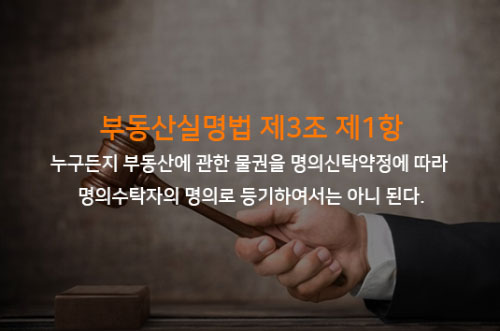이처럼 부동산실명법은 지난 1995년 3월 30일 최초 제정되어 10년 이상 시행되고 있으나 많은 시민들의 인식 부족으로 부동산을 권리자명의등기에 관한 법률(이하 부동산실명법) 위반자가 증가하고 있습니다. 가장 많은 위반 사례로 '부동산 관리의 편의를 위하여' 또는 '잘 몰라서' 등의 명의수탁자 명의로 부동산을 등기하는 경우입니다.