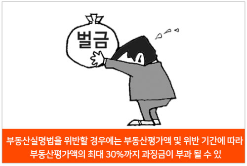 부동산 실명법은 부동산등기제도를 악용한 투기․탈세․탈법 행위 등의 예방을 목적으로 하고 있기 때문에 부동산평가액 및 위반 기간에 따라 부동산 평가액의 최대 30%까지 과징금이 부과될 수 있습니다.
