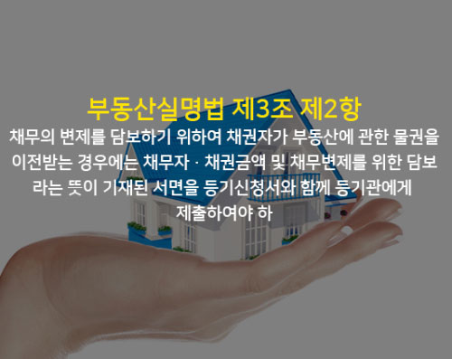 부동산실명법 제3조 제2항은 "채무의 변제를 담보하기 위하여 채권자가 부동산에 관한 물권을 이전받는 경우에는 채무자, 채권금액 및 채무변제를 위한 담보라는 뜻이 적힌 서면을 등기신청서와 함께 등기관에게 제출하여야 한다."입니다.