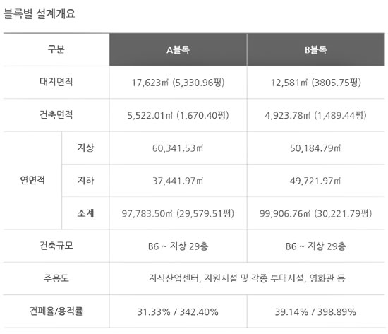 단지는 42,777㎡ 대지에 연면적 197,690.26㎡(59,906.13평) 지하 6층~지상 29층 규모로 구성된 지식산업센터입니다. 저층부 지하 1층부터 1층까지는 지원시설인 상가, 어린이집, 지상 2층은 컨벤션센터, 건강검진센터 등이 입주합니다. 저층부 별동으로 조성된 문화시설에는 830석 규모의 영화관이 입주합니다. 지상 3층부터 29층까지는 전용면적은 30~ 40평형의 지식산업센터(공장) 호실입니다.