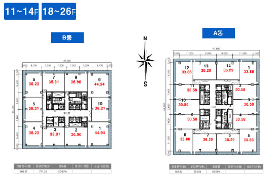 A동 11층~14층과 18층~26층은 층고 4.0m이며 지식산업센터(공장) 14개 호실로 구성되어 있습니다. B동은 층고 4.0m이며 지식산업센터(공장) 10개 호실로 구성되어 있습니다.