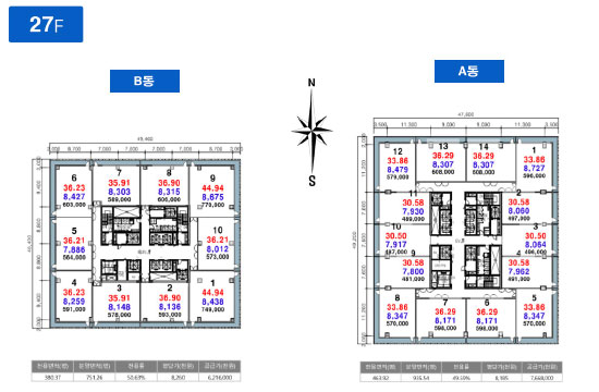 A동 27층은 층고 4.5m이며 지식산업센터(공장) 14개 호실로 구성되어 있습니다. B동은 층고 4.5m이며 지식산업센터(공장) 10개 호실로 구성되어 있습니다.