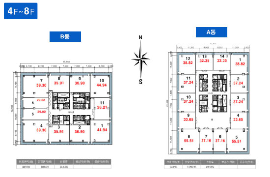 A동 4층 층고 5.0m, 5층~7층 층고 4.3m, 8층 층고 5.0m이며 지식산업센터(공장) 14개 호실로 구성되었습니다. B동은 4층~7층 층고 4.3m, 8층 층고 5.0m이며 지식산업센터(공장) 10개 호실로 구성되었습니다.