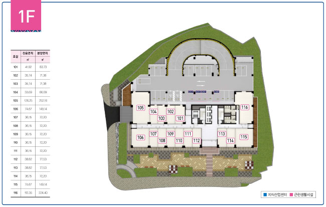 - 외부 주차장 및 근린생활시설(상가) 16실, 층고 5.1m, 천정고 3.6m