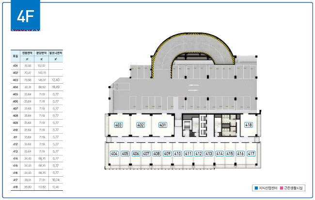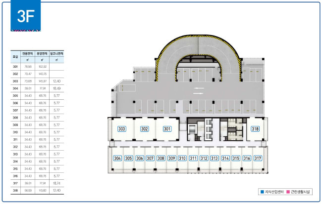 지하 1층부터 4층까지 주차장과 드라이브인 시스템을 적용, 화물 전용 엘리베이터를 배치해 물류 이동이 원활히 할 수 있도록 하였습니다. 전 호실은 서비스로 제공되는 발코니를 적용해 실사용 면적보다 넓게 사용할 수 있도록 하였으며, 입주사 직원들의 업무 편의성을 높이기 위해 옥상정원과 휴게공간을 제공하였습니다.