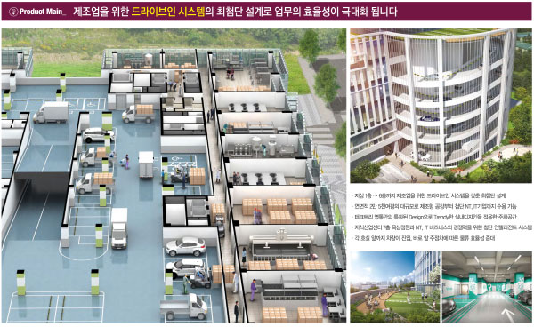 이외에도 사업장 입구에서 논스톱으로 편리하게 제품을 상·하차할 수 있는 드라이브인 시스템을 적용하였으며, 직원들의 업무 편의성을 높여주기 위한 상업시설, 기숙사 등 특화 설계가 적용되었습니다. 기타 자세한 내용은 아래를 참고하세요.