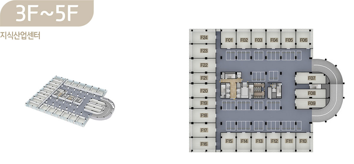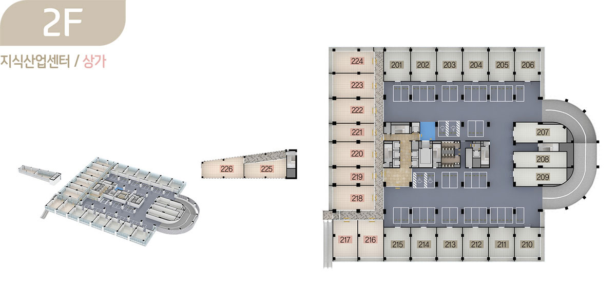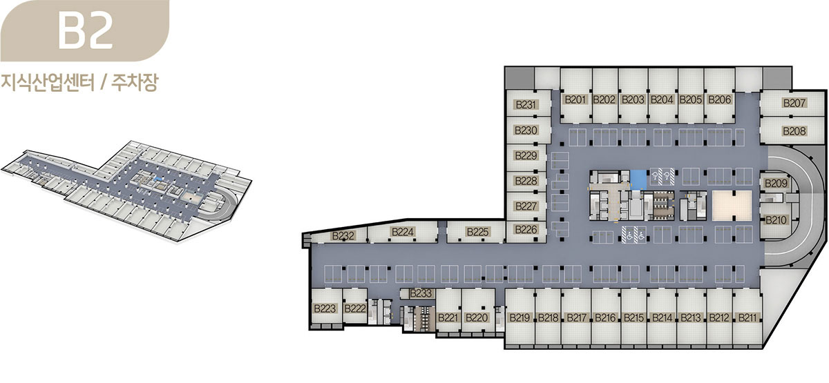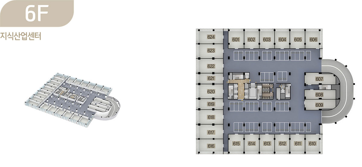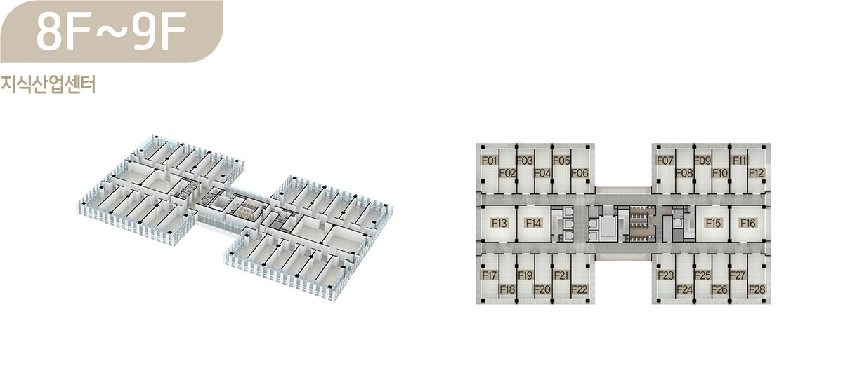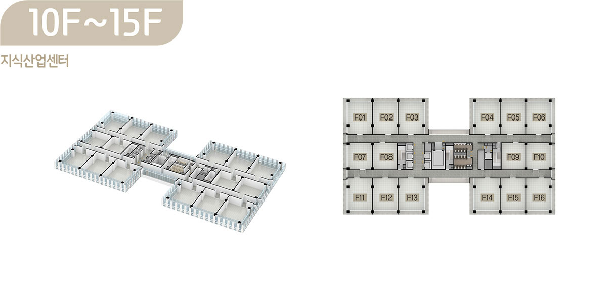 드라이브인 시스템이 적용된 공장형 지식산업센터는 지하 2층부터 지상 6층까지로 제조업, 물류창고 등 원자재나 물류량이 많은 업체가 사용하기에 안성맞춤이며, 오피스형 지식산업센터는 지상 7층부터 15층까지로 모든 호실을 중소형 크기의 섹션 형태로 구성해 입주 기업들이 원하는 만큼 공간으로 활용할 수 있도록 하였습니다.
