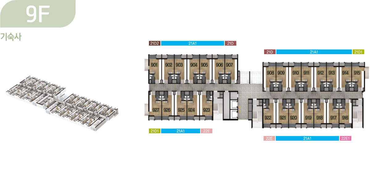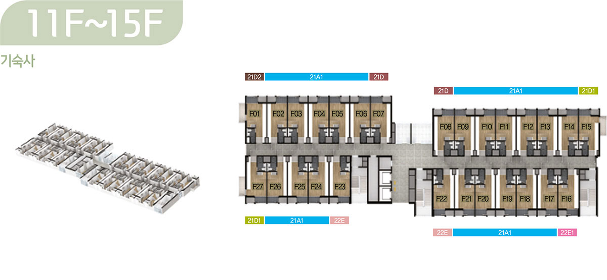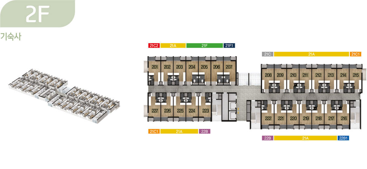 기숙사는 총 378개 호실이며, △ 단층형 : 21A1 타입(130실), 21C1 타입(14실), △ 복층형 : 21A1 타입(133실), 21D1 타입(14실)
