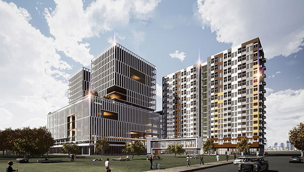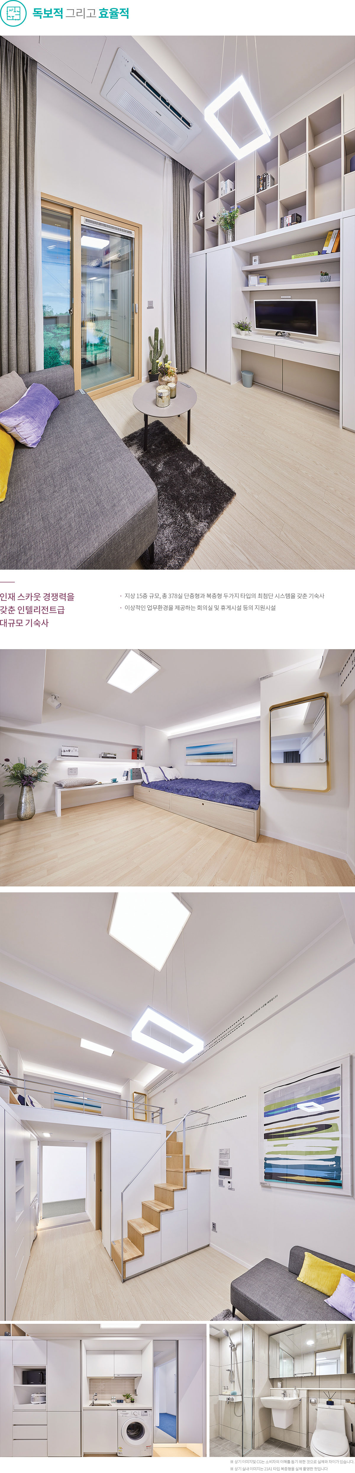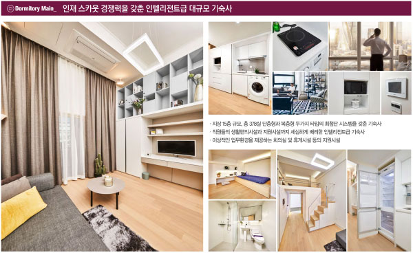 지식산업센터 입주 직원들이 사용하는 기숙사는 최근 주거 트렌드를 반영해 롯데건설 만의 특화 설계를 반영했습니다. 모든 호실이 단층형과 복층형 원룸 두 가지 타입의 혁신적인 평면구성으로 공급되었습니다. 공간 활용을 최대한 하기 위해 세탁기와 냉장고, 시스템 에어컨 등의 가전과 현관 신발장, 붙박이장, 계단 수납공간 등의 가구가 기본 제공되는 빌트인 시스템이 특징입니다. 또한 입주민을 위한 전용 층별 라운지, 취사장, 공중정원 등 입주민의 편의를 위해 커뮤니티 시설까지 갖추었습니다.