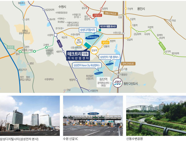 특히 테크트리 영통은 삼성전자 본사와 삼성디지털시티를 비롯해 삼성전자 기흥∙화성 캠퍼스 등이 자리해 삼성 프리미엄 비즈니스 벨트의 중심에 위치하고 있으며 인근 수원 일반 산업단지도 멀지 않아 인근 협력 업체를 끌어들이는 다양한 배후 수요 확보가 예상되는 곳이어서 입지적인 메리트가 높게 평가됩니다.