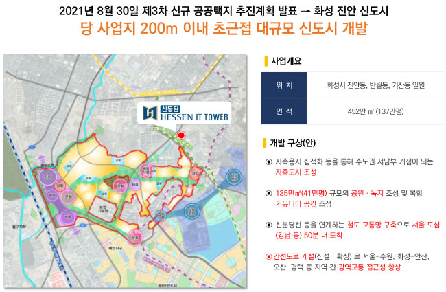 신동탄 헤센 IT 타워는 최근 정부가 발표한 화성 진안 택지개발지구와 인접해 있는 곳으로 향후 가장 큰 수혜를 보게 될 것으로 보입니다. 단지는 화성시 반월지구 도시지원시설 E1 BL에 위치하며 지하 3층~지상 12층 규모의 지식산업센터를 건립하는 사업으로 지식산업센터(공장) 연면적 약 10,873평, 지원시설(상가) 약 3,700평으로 조성됩니다. 지식산업센터 모두 서비스면적으로 제공되는 발코니가 있으며, 복층으로 사용할 수 있도록 층고를 높게 구성하였습니다. 주차대수는 법정대수의 2배가 넘는 공간을 확보하였습니다.
