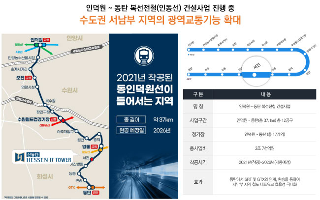 2026년 개통 예정인 인동선(인덕원과 동탄을 연결)은 수도권 서남부 지역과 서울 동남부 지역의 광역교통 기능은 물론이고 대중교통 서비스 개선을 목적으로 하고 있습니다. 향후 SRT(고속철도), GTX-A 노선과 인동선, 영통 분당선과 수원 광교 신분당선과 환승이 가능하게 되면 수도권 서남부 지역의 핵심 교통망이 될 것으로 기대를 모으고 있습니다.