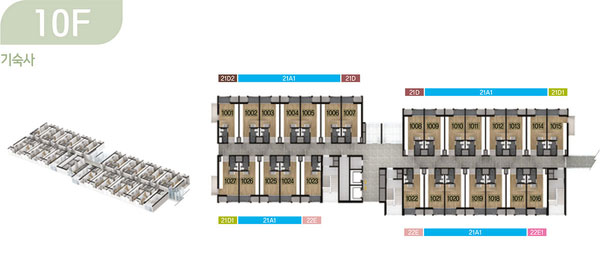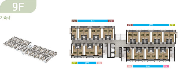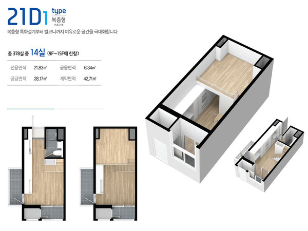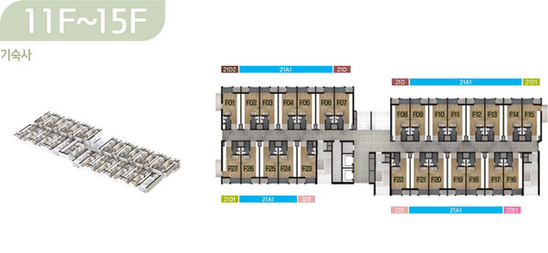 ○ 9층~15층 147실, 21A타입(133실), 21D1(14실) 복층형 유니트으로 구성