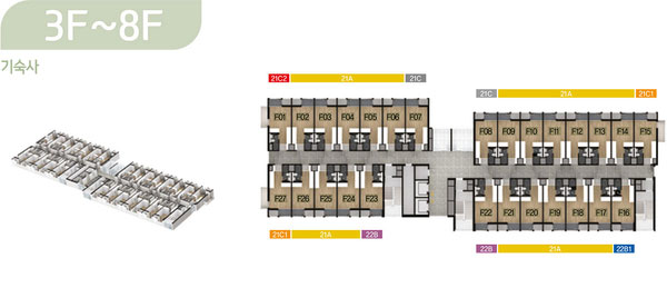 ○ 2층~8층 144실, 21A타입(130실), 21C1(14실) 단층형 유니트으로 구성