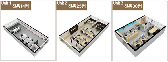 에이스 하이엔드 타워 영통은 전용 14평, 전용 25평, 전용 30평 등 3개 호실로 구성되었습니다. 각 호실들은 섹션으로 되어 있어 사용 면적에 따라 호실들을 조합하여 사용하면 됩니다. 참고로 위 평형대는 지식산업센터에 입주하는 기업들이 가장 선호하는 기본 평형입니다.