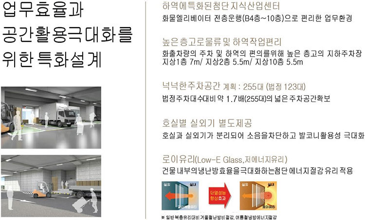 주차 대수는 계획 255대(법정 123대)로 법정 대수 보다 2배 이상 많습니다. 층고는 2층과 10층은 5.5m로(천정고 4.5m) 높게 구성해 복층으로 활용할 수 있게 하였으며, 3층부터 9층까지는 3.9m로 구성해 입주기업들의 편의성을 확보하였습니다. 각층별 지식산업센터는 18~20개 호실로 전용 14평, 전용 25평, 전용 30평 등 다양하게 구성되었습니다.