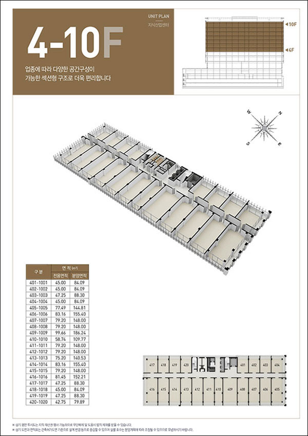 4층부터 9층까지는 일반층(층고:3.9m),10층은 복층형(층고:5.5m)으로 되어 있으며, 각 층별 지식산업센터 20개 호실로 구성되었습니다.