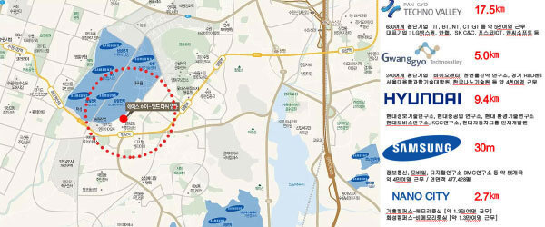 삼성 디지털시티가 단지에서 30m 거리에 위치한 만큼 삼성디스플레이 기흥캠퍼스, 삼성 나노시티, 수원 일반산업단지, 병원 등이 위치하고 있어 배후수요도 풍부한 지역이기 때문에 투자가치도 매우 높은 단지입니다. 무엇보다 영통구는 10년간 지식산업센터 공급이 부족한 지역으로 분류되어 희소가치에 따른 안정적인 수익과 높은 미래가치가 기대되는 지역입니다.